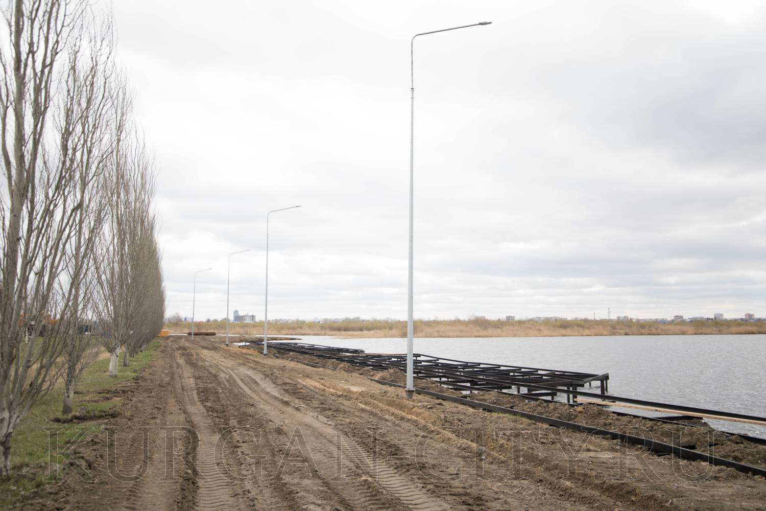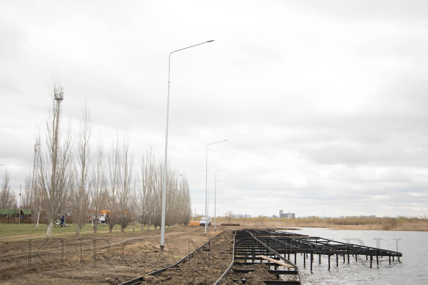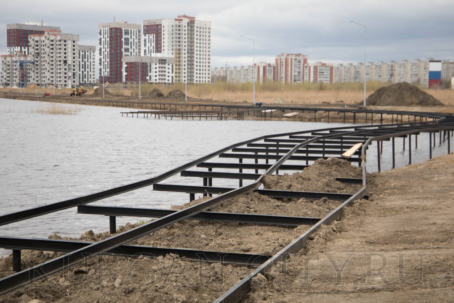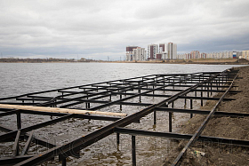 Из объектов благоустройства были проверены работы на озере Черное в Заозерном микрорайоне. В настоящий момент подрядчик устанавливает вдоль береговой линии металлическую обрешетку, на которую в последующем будет укладываться деревянный настил.